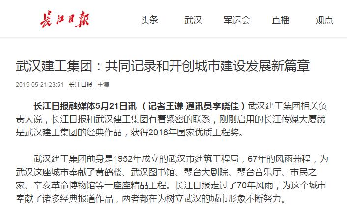 長江日報融媒體5月21日訊 (記者王謙 通訊員李曉佳)武漢建工集團相關(guān)負(fù)責(zé)人說,長江日報和武漢建工集團有著緊密的聯(lián)系,剛剛啟用的長江傳媒大廈就是武漢建工集團的經(jīng)典作品,獲得2018年國家優(yōu)質(zhì)工程獎。